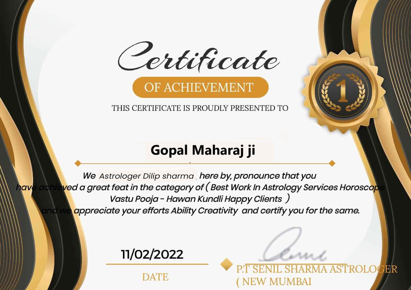 Gopal Maharaj Ji is an astrologer who has persuaded people to see astrology as a reality and utilise it to resolve life's problems. Ever from his early years, he has been fascinated by the cosmic forces. This is the reason he decided to study astrology and become into An astrologer. To the best of his knowledge and astrological experience, he has helped countless people. He has received numerous noteworthy honours for his efforts thus far. Jyotih ji is constantly willing to learn more about astrology, according to Raj Krisha. This motivates him to take part in seminars and courses that are based on astrology.