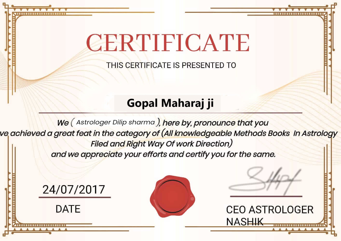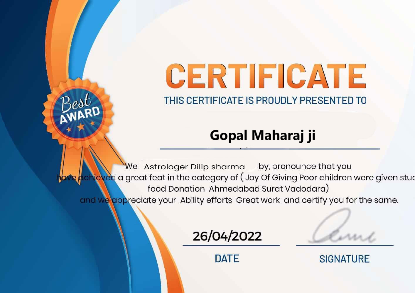 Gopal Maharaj Ji is an astrologer who has persuaded people to see astrology as a reality and utilise it to resolve life's problems. Ever from his early years, he has been fascinated by the cosmic forces. This is the reason he decided to study astrology and become into An astrologer. To the best of his knowledge and astrological experience, he has helped countless people. He has received numerous noteworthy honours for his efforts thus far. Jyotih ji is constantly willing to learn more about astrology, according to Raj Krisha. This motivates him to take part in seminars and courses that are based on astrology.